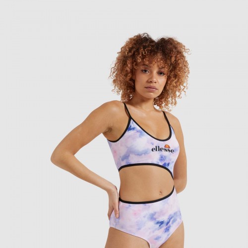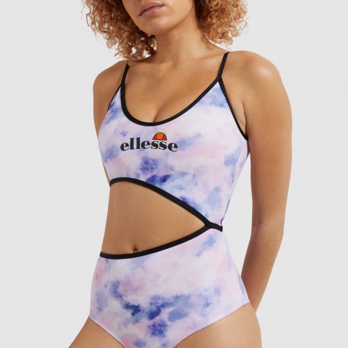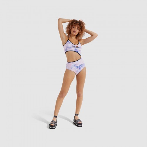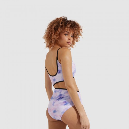 Bañador de mujer con estampado tie dye, corte lateral triangular, ribetes en contraste alrededor del escote, la espalda y el corte. Diseño de espalda baja, y copas acolchadas internas.