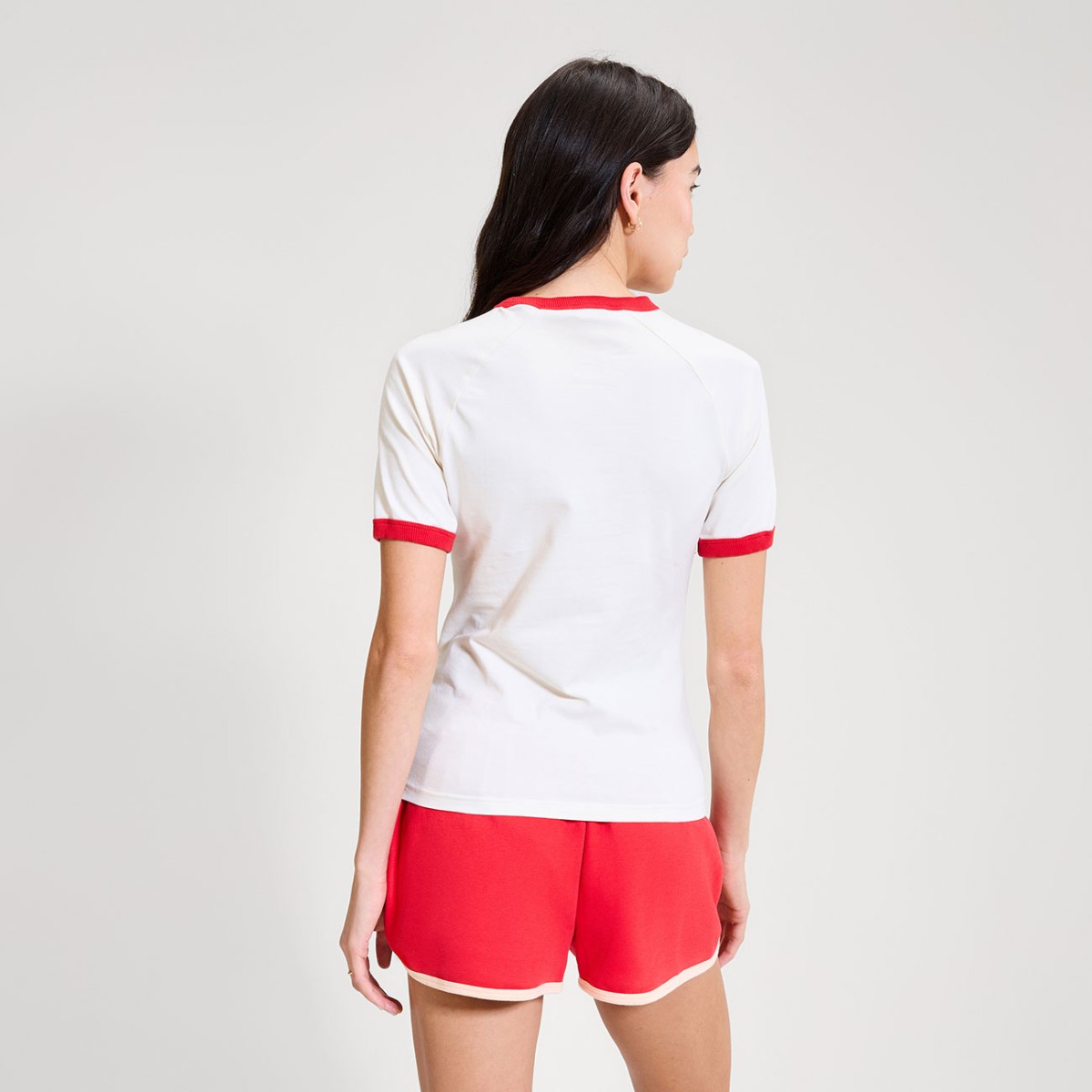 Una prenda básica veraniega de la colección Resort Stripes, inspirada en la ropa casual italiana. Esta camiseta elástica de canalé es fácil de combinar y aún más fácil de amar. Los ribetes en contraste y el logo bordado en