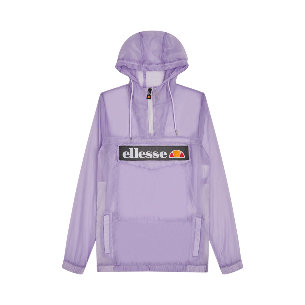 Chaqueta translúcida con capucha, y bolsillo tipo canguro con parche de lona.
