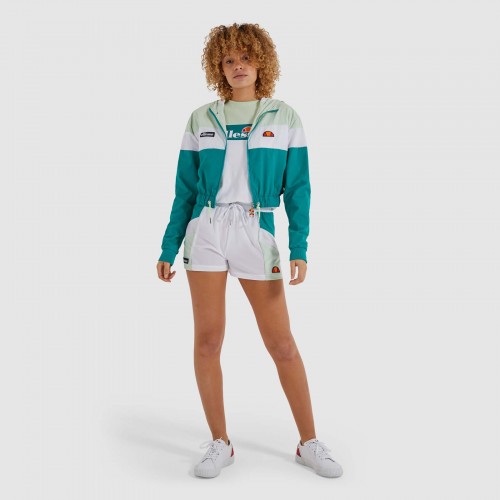 Chaqueta de mujer estilo cropped, con capucha, paneles de colores a contraste, y cordón ajustable en la cintura.