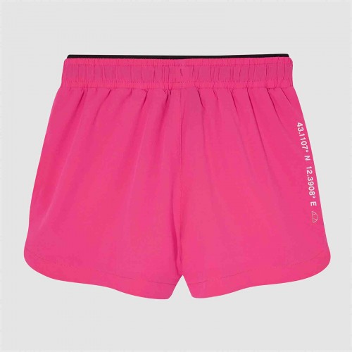 Pantalón corto de niña en tejido ligero, con insignias semi palla y Ellesse bordadas en ambos muslos. Cintura con cordón de punto. Ribete de contraste a lo largo de la costura. Bolsillo trasero con lengüeta tejida a la entrada.
