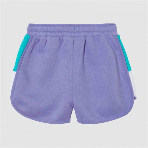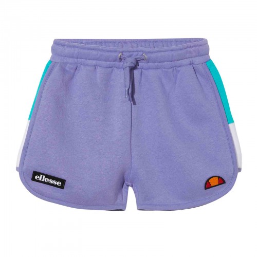 Calção infantil feminino em tecido leve com insígnias de semi-palla e Ellesse bordadas em ambas coxas. Cós com cordão de malha. Painéis coloridos com contraste ao longo da costura. Bolso traseiro com etiqueta bordada na entrada.