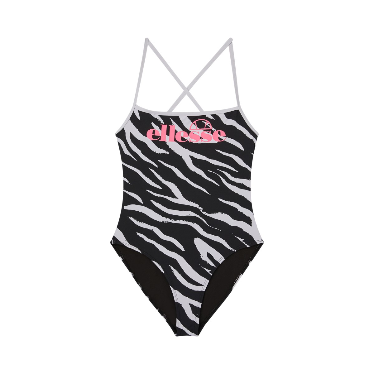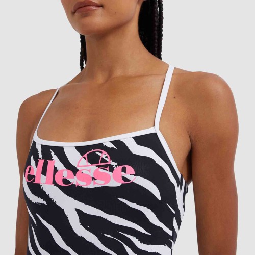 fato de banho com decote quadrado, logotipo no peito e costas espetaculares com fitas cruzadas e atadas.