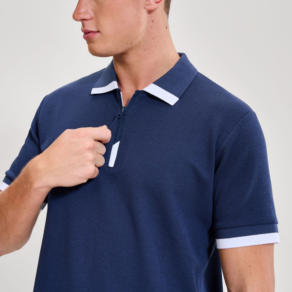 O Polo Kelvias. Inspirado nas tradições animadas dos desportos de bola de inverno, este é o Giochi Invernali. Confeccionado em piqué de mistura de algodão com propriedades de absorção do suor e gola canelada. Apresenta punhos em jacquard, fecho de nylon estampado e logótipo em silicone transferido a quente.