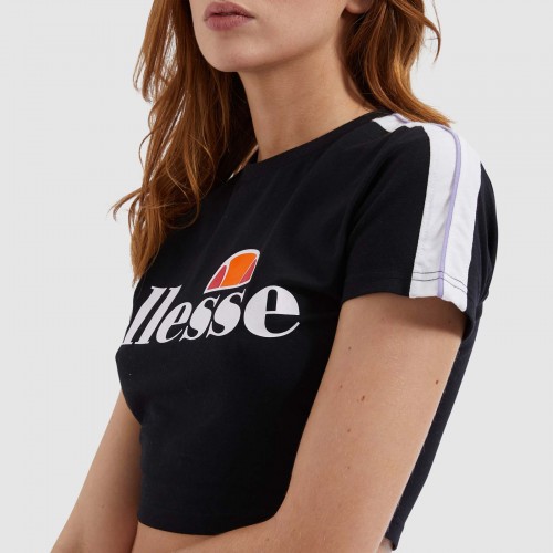 Top cropped com logotipo maxi no peito e pormenor de riscas nas mangas.