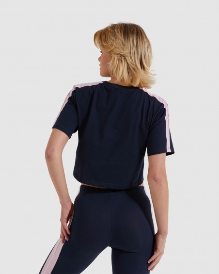 T-shirt cropped feminina de manga curta com detalhes do logo bordados no peito e painéis de listras nas mangas.