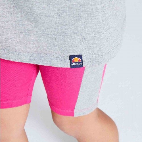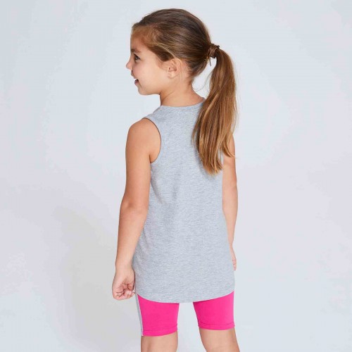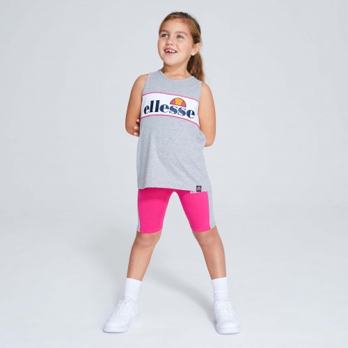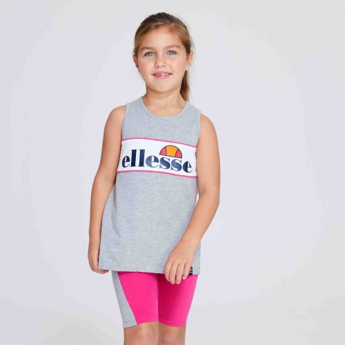 T-shirt de menina sem mangas, com painel contrastante no peito com estampa ellesse em plastisol e acabamento nas bordas. Corte nas cavas e no pescoço, com aba de tecido na bainha.