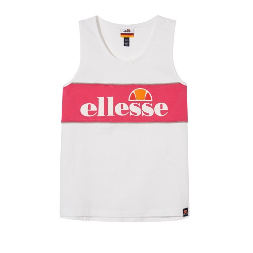 T-shirt de menina sem mangas, com painel contrastante no peito com estampa ellesse em plastisol e acabamento nas bordas. Corte nas cavas e no pescoço, com aba de tecido na bainha.