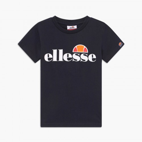 t-shirt comprida de menina com corte clássico e gola circular canelada. Estampa Ellesse no peito com aba de tecido na manga.